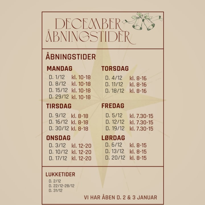 Vi har udvidet åbningstider i december, hvis du ikke kan finde en tid der passer, så er du altid velkommen til at ringe ind til os, så vil vi prøve at være behjælpelige med at finde en tid til dig.